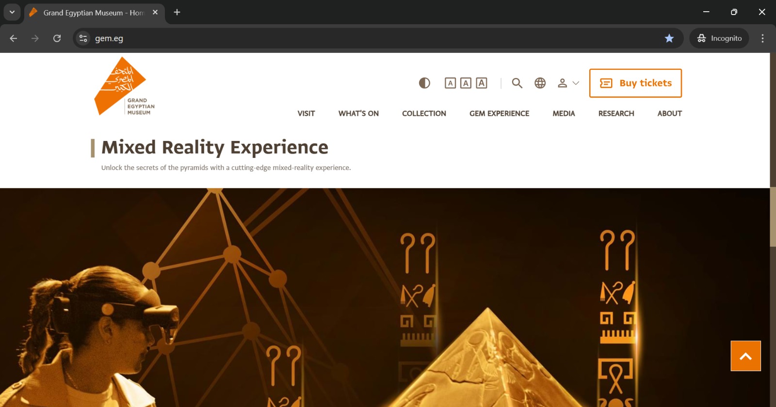 كما يستعرض قسم “يحدث الآن” أحدث الأخبار والمؤتمرات والمعارض المؤقتة بالمتحف، أما قسم المجموعات الأثرية فيسلط الضوء على أبرز الكنوز الفرعونية والمقتنيات الفريدة، إلى جانب معلومات متكاملة عن مركز ترميم وصيانة الآثار بالمتحف، كما يمكن للزائر استكشاف التجربة الكاملة التي يقدمها المتحف، وتشمل متحف الطفل، والمركز التعليمي، ومركز الفنون والحرف اليدوية، بالإضافة إلى دليل الإتاحة ومعلومات حول تجربة الواقع المختلط الافتراضي التي ينفرد بها المتحف المصري الكبير كأحدث تجربة ثقافية تفاعلية في المنطقة.