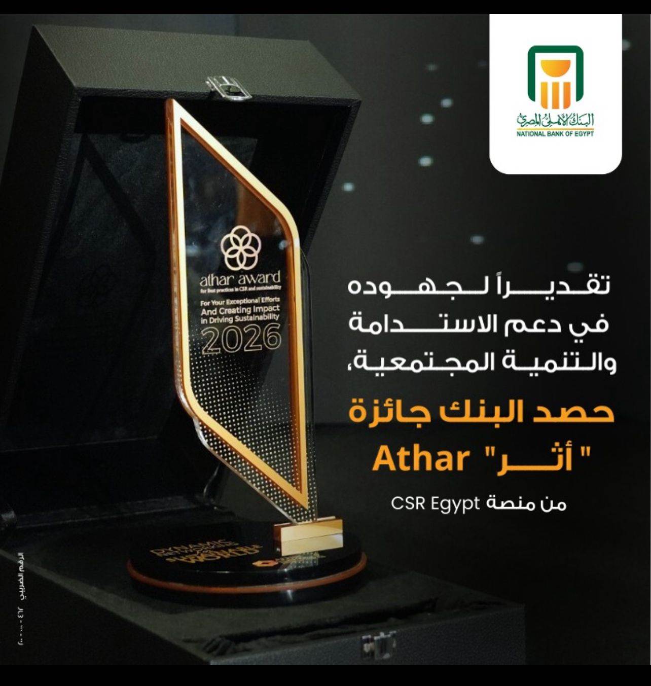 أعلن البنك الأهلي المصري، حصوله على جائزة “أثر” (Athar) المرموقة، التي تمنحها منصة CSR Egypt تقديرًا للجهود الاستثنائية في مجال العمل المجتمعي والمبادرات التنموية.