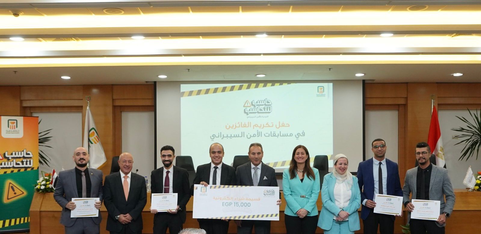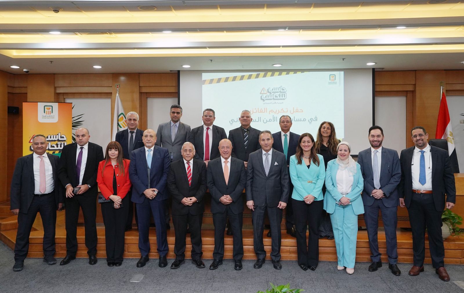 كرم محمد الأتربي الرئيس التنفيذي للبنك الأهلي المصري، الفائزين من العاملين بالبنك في فعاليات التوعية بالأمن السيبراني.