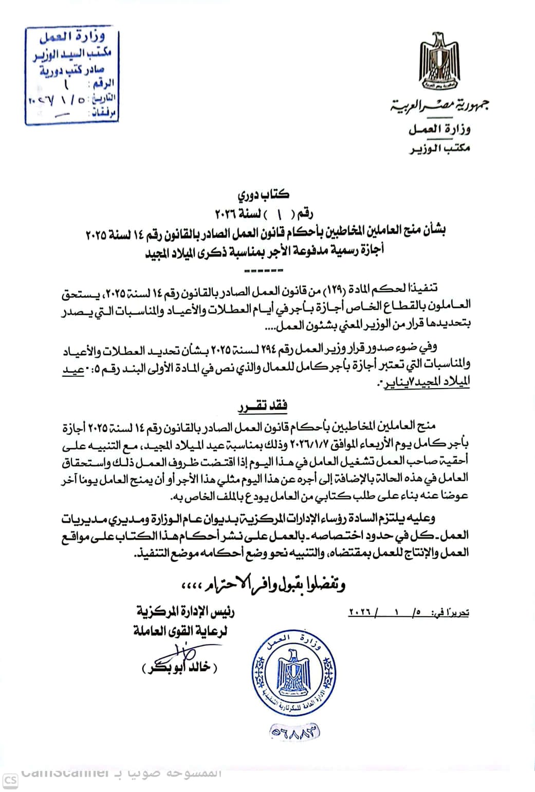 أعلن وزير العمل محمد جبران اليوم الاثنين، أن يوم الأربعاء المقبل الموافق 7 يناير 2026، إجازة رسمية مدفوعة الأجر، بمناسبة عيد الميلاد المجيد، وذلك للعاملين في شركات القطاع الخاص المخاطبين بأحكام قانون العمل الصادر بالقانون رقم 14 لسنة 2025.