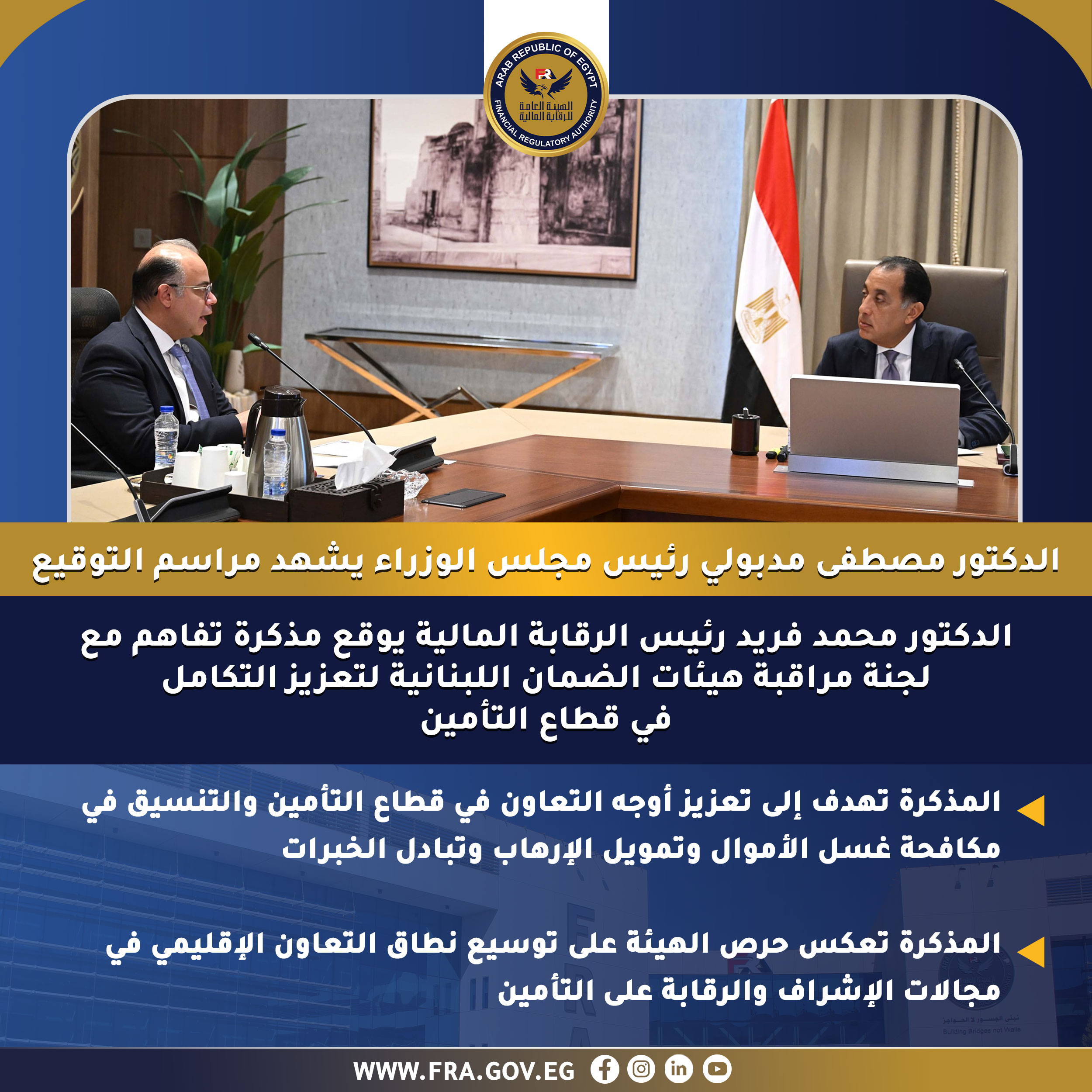 شهد الدكتور مصطفى مدبولي، رئيس مجلس الوزراء، مراسم توقيع مذكرة تفاهم بين الهيئة العامة للرقابة المالية المصرية ولجنة مراقبة هيئات الضمان اللبنانية، بهدف تطوير التعاون الثنائي في مجالات الإشراف والرقابة على قطاع التأمين، ومكافحة غسل الأموال وتمويل الإرهاب، وتبادل الخبرات الفنية والتشريعية بين الجانبين.