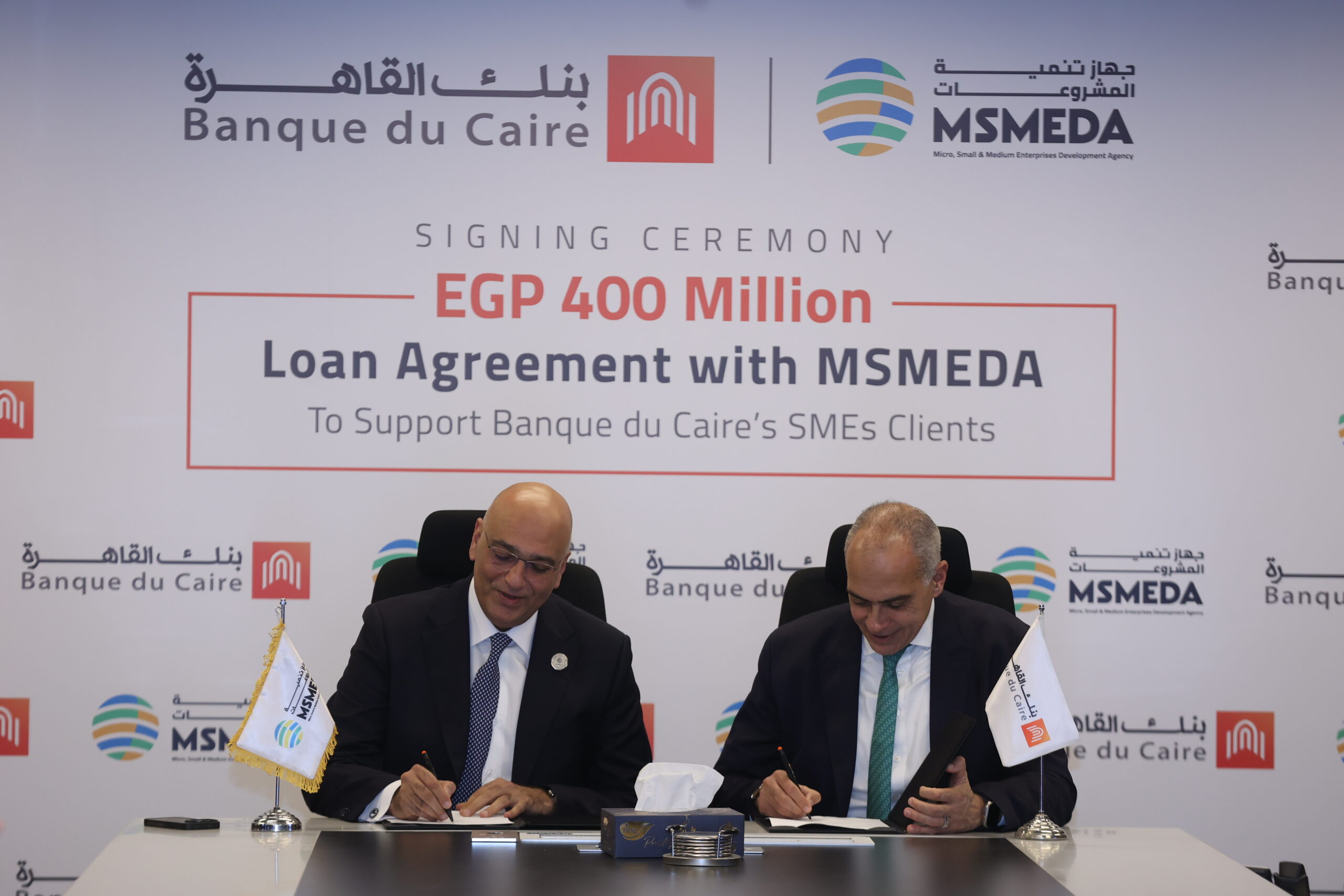 تم توقيع الاتفاقية من قبل باسل رحمي، الرئيس التنفيذي لجهاز تنمية المشروعات، و بهاء الشافعي، نائب الرئيس التنفيذي لبنك القاهرة، بحضور كل من حسين أباظة، العضو المنتدب والرئيس التنفيذي للبنك، و أحمد عفت، نائب الرئيس التنفيذي، والأستاذ أيمن خطاب، رئيس قطاع المؤسسات المالية، و ناديا علاء الدين إبراهيم، القائم بأعمال رئيس مجموعة الشركات الصغيرة والمتوسطة. كما حضر عن جهاز تنمية المشروعات كل من محمد مدحت، نائب الرئيس التنفيذي، و محمد أسامة بكري، رئيس القطاع المركزي لتمويل المشروعات المتوسطة والصغيرة.
