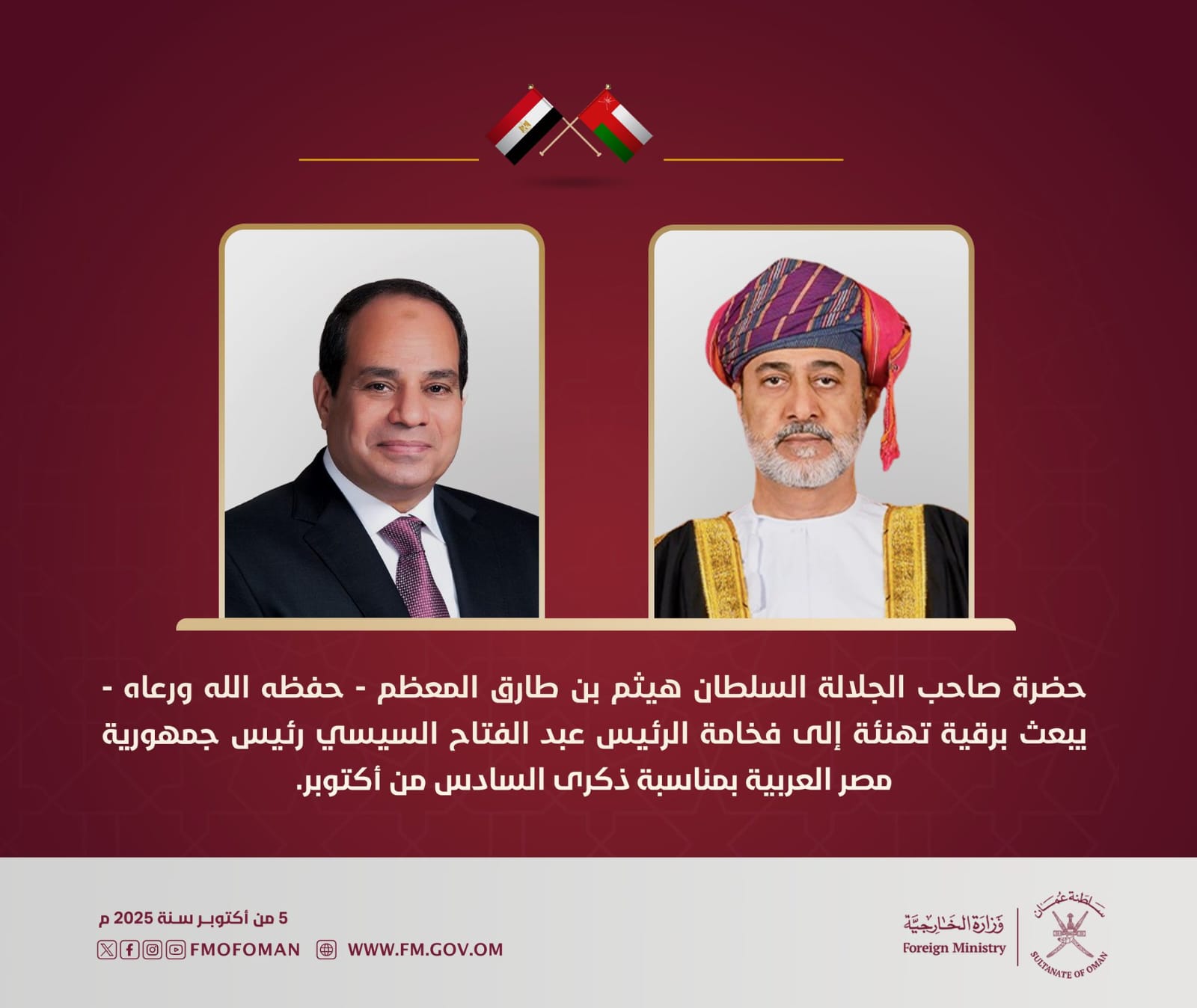 بعث السلطان هيثم بن طارق سلطان سلطنةعُمان، برقية تهنئة إلى الرئيس عبدالفتاح السيسي، بمناسبة ذكرى السادس من أكتوبر، معربا عن أطيب التهاني والتبريكات للرئيس والشعب المصرى بهذه المناسبة المجيدة، راجيًا لجمهورية مصر العربية اطراد التقدم والتطور والنماء.