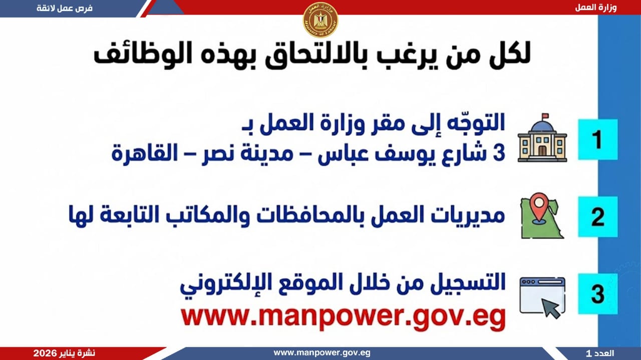 وبيّنت الوزارة أن التقديم على هذه الفرص يتم خلال شهر يناير 2026، من خلال الإدارة العامة للتشغيل بمقر الوزارة القديم بمدينة نصر، أو عبر مديريات العمل بالمحافظات، كما يمكن التقديم مباشرة من خلال بيانات الشركات المرفقة بالنشرة، أو عبر الموقع الرسمي لوزارة العمل على شبكة الإنترنت.. وأضافت أن نشرة التوظيف نصف الشهرية تُصدر بصفة منتظمة كل 15 يومًا من خلال الإدارة العامة للتشغيل، برئاسة هبة أحمد، وإعداد منى شوقي – باحث أول بالإدارة، وتتضمن أحدث فرص العمل المتاحة في المحافظات.