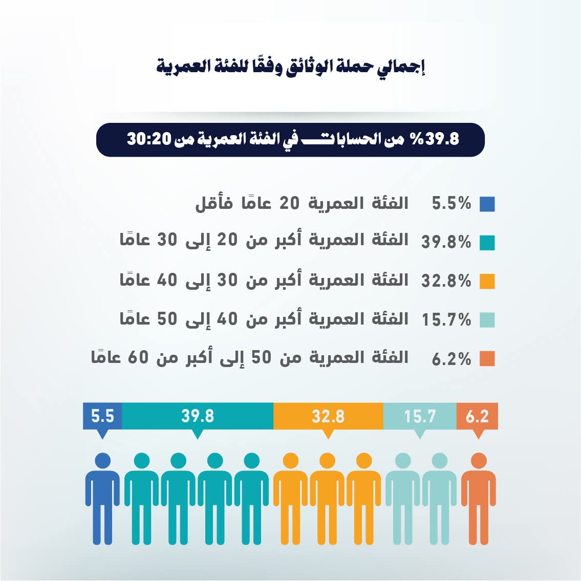كما أشار إلى أن الفئة العمرية ” أكبر من 20 إلى 30 عامًا “استحوذت على النسبة الأكبر من حسابات هذا النوع من الاستثمار، بنحو 39.8%.